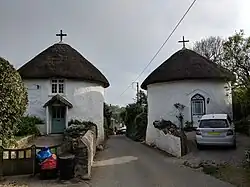 In the 19th century Veryan's vicar and local land owner Jeremiah Trist expanded the village's buildings.[11] He convinced parishioners to attend church on a regular basis, and built two schools and a series of round houses. The school for boys was built in 1814, and on its site now stands the present infant and junior school. A "school of industry" for girls was also built, now a thatched house behind the New Inn.[12] The round houses were built between 1815 and 1818 by Trist, inspired by one in St Winnow. There is a pair at the entrance to the village at Veryan Green and another two at village entrance on the Pendower road. All four are thatched, while a fifth behind the school has a slate roof.[12][11] Trist installed crosses on each of the houses and they were said to deter the devil from entering the village.[13] The large house, Parc Behan, overlooking the church was also built by Trist as his dwelling: the vicarage was too small and in a bad state of repair.[12]
