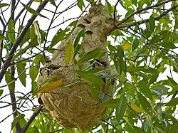 Vespa tropica are raiders of the nests of other wasp species and take captured larvae back to their own nest to feed to their larvae. They have been observed to catch honeybees quite frequently, and even dragonflies have been noted as prey. A worker of V. tropica has been recorded as capturing and killing an individual of Vespa bicolor[1] and also raiding nests of other polister wasps such as Ropalidia marginata. Vespa tropica is associated with forests in the lowlands, up to 2,100 metres (6,890 ft) altitude.[9] The nests are usually within 3 metres (3 yd) above the ground in tree hollows or in subterranean cavities normally down to a depth of 20 centimetres (8 in) including a record of one found inside a dead log partly buried in the soil. In the vicinity of human habitations it will nest under roofs, in attics and sheds.[2][9] The nest is normally rhomboid or bowl-shaped and has an open bottom, whereas most aerial hornets' nest are completely sealed. The outer shell of the nest consists of distinct, broad layers and the nest is quite brittle. Occasionally nests are built within the crown of trees.[1] Nest temperature is maintained at 25–30 °C (77–86 °F) until about the middle of October, when it trends towards ambient[Martin-1990 1]