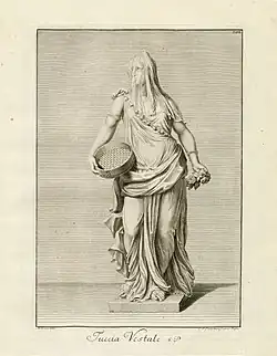 This effort was not the first time Corradini addressed the subject. In 1724 he sculpted a bust of a Vestal which today is a part of the collection of the Skulpturensammlung in Dresden.[5][6] A 1733 portfolio of engravings illustrating sculptures in Dresden's Skulpturensammlung collection includes a picture of a veiled Tuccia, presumably by Corradini.[3][7][8]