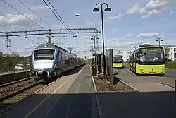 Vestby Station is served by the line R21 of the Oslo Commuter Rail, which is operated by Vy.[20] The line runs from Oslo to Moss.[21] The service has two southbound stations before reaching Moss: Sonsveien and Kambo.[22] Travel time to Oslo Central Station is 33 minutes and to Moss 16 minutes.[23][24] The public transport authority Ruter operates bus services to the station from conurbations around Vestby.[25]