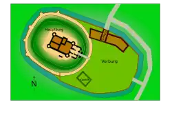 The rectangular main building, a keep about 25 metres (82 ft) long and 15 metres (49 ft) wide with three upper stories and a basement, was secured by four round towers attached to its edges, a wall and a moat.[4] One of the keep's towers (Hungerturm) was used as a dungeon to incarcerate abducted people held for ransom.[4] Attached to the keep's eastern front was the entrance building (Vorschloß), about 10 metres (33 ft) long and 12 metres (39 ft) wide.[4] In front of the entrance to the keep, which could be reached by a drawbridge, laid the courtyard (Vorburg), and both the keep and the courtyard were surrounded by an outer wall and another moat.[4]