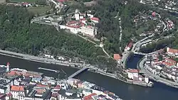 The location of the fortress is the St. Georgsberg mountain, 105 metres (344 ft) above the valley floor between the Danube and the Ilz. Steep cliffs fall off on both sides. The smaller Veste Niederhaus, connected to Veste Oberhaus by a battlement, is located below on the bank of the Danube; this addition, made after 1367, created a double fortress almost 700 metres (2,300 ft) in length.[2]