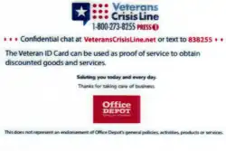 ![]() The reverse of the card, bearing the logo of Office Depot (the card's manufacturer) and a telephone number for the Veterans Affairs crisis hotline. | |