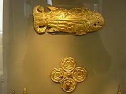 - an electrum plaque (41 x 15 cm, 608 g) in the shape of a fish,[1] which probably dates to the end of the 6th century BC. According to Furtwängler, it was originally an ornament (sema) on a shield. The body of the fish is covered by little animals in relief, including a panther catching a boar, and a lion catching a deer, and the tail is made up of two rams' heads. It is believed to have been made by the artisans of an Ionian colony on the northern coast of the Black Sea, such as Olbia or Panticapaeum, to cater to the tastes of a Scythian prince.