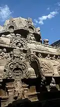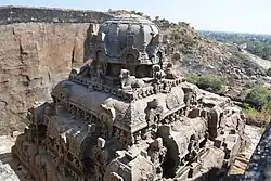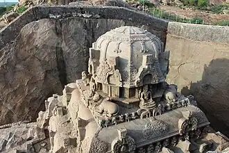 Historians have equated the temple with similar temples across India based on the monolithic classification and being carved in-situ out of a pre-existing rock. Historian K. V. Soundara Rajan believes that the temple is similar in architecture to that of Virupaksha Temple at Pattadakal in Karnataka by Vikramaditya II during 734–44 CE, Kanchi Kailasanathar Temple built by Narasimhavarman II during 685–705 CE and Kailasa temple, Ellora by Krishna I during 756–77 CE.[7] Some historians suggest that the similarities in the architecture are indicative of the political relations between the Pallavas, Rashtrakutas and Chalukyas. This view has been disputed by other historians.[8]