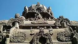 The temple is carved out from a single rock in a rectangular portion measuring 7.5 m (25 ft) in depth. The carvings in the temple show the top portion of the temple, with an unfinished bottom. The sculptures and the carvings are indicative of Pandyan art during the period.[3] The granite rock looks like a blooming lotus, with hills surrounding it on three sides. The vimana (ceiling over the sanctum) has niches of Parsavadevatas, the attendant deities of Shiva, like ganas, Dakshinamurthy depicted playing a mridanga, Siva with his consort Uma, dancers, various niches of Nandi (the sacred bull of Shiva) and animals like monkeys and lions. Historian Sivaramamurti states that this is the only site where Dakshinamurthy is depicted playing the Mridanga (a percussion instrument), while in all other places, he is depicted playing Veena. According to epigrapher V. Vedachalam, there is a spontaneity in the sculptures indicating of natural human movements like in the Shiva and Uma sculpture where they seem to be talking like common folks.[4] The Vettuvan Koil is an unfinished Shiva temple.