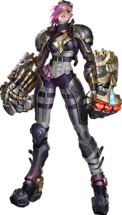 Vi was added to the roster of playable Champions for League of Legends on December 19, 2012.[7] Vi's main weapons are the "Atlas Gauntlet", two massive gloves powered by Hextech that increases her physical strength to superhuman levels. Her gameplay mechanics have undergone a number of revisions since her introduction. Dot Esports noted while Vi's original moveset and statistics stood out for being more suited for the top lane, her abilities and their effects have remained mostly the same without any major changes. The character was banned from professional play for a time in early 2020 due to a potentially game-breaking bug.[8] A “micropatch” was released in November 2021 to downgrade her base statistics and ultimate abilities, which were unintentionally boosted by a prior rescript that in Riot's opinion made her somewhat overpowered.[9]