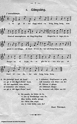 Olof Thunman was an enthusiastic hiker and well known in the areas around Uppsala where he hiked in his steel-shod ski boots, suit and overcoat. He was inspired by the philosopher Jean-Jacques Rousseau for whom walking was a necessity of life and not a question of movement. He wrote this hiking song in 1900 when he was 21 years old. Different versions of the origin of the song exist, but according to Ellenius, it was created after a happy evening at the railway hotel in Flen. Thunman was serving as tutor to the sons of bank director Henning Ericsson in Flen, and he had spent a summer evening in 1900 at the hotel restaurant with the oldest son Edwin and station writer Hjalmar Hökberg, which ended with a walk on a road towards Stenhammar Palace. Edwin Ericsson played accordion and Thunman improvised the first lines of Vi gå över daggfriska berg (We go over dew-fresh mountain) which was later changed to daggstänkta (dew-sprinkled).[1]