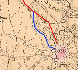 ![]() The ancient Via Triumphalis (denoted by the lower, blue-colored line), which stretched from Rome to the Via Cassia (denoted by the top, red-colored line) | |