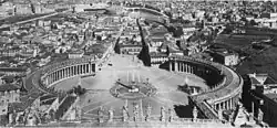 Further momentum was lost when Gian Lorenzo Bernini was commissioned to redesign the terrace in front of the Basilica in 1656. After discarding several sketches, Bernini settled on a colossal open space in the shape of an ellipse. With the potential expense of clearing Borgo, Bernini decided instead to make use of the warren of poorly maintained medieval buildings to obscure any view of the Vatican structures from any significant distance. In this way, pilgrims emerged from the relative darkness of the city into the vast open space and grandeur of the Square and its surrounding buildings – a sight calculated to inspire awe in first-time visitors to the Holy See's seat of power.[5] Bernini had originally planned to demolish a square roughly 100 m to a side directly in front of the square, filling the space with a third colonnade (or "terzo braccio") to match the two still standing today. This would afford a longer vantage point to allow visitors a better viewing angle of the new Basilica. The death of his patron, Pope Alexander VII, put a halt to Bernini's work. The third set of columns was abandoned, and Bernini's piazza remained open-ended and incomplete.[10]