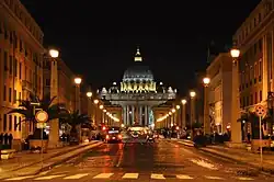 Despite being one of the few major thoroughfares in Rome able to cope with a high volume of traffic without congestion,[3] it is the subject of much ire both within the Roman community and among historical scholars due to the circumstances under which it was constructed.[4][5] The area around the church was rebuilt several times following the various Sacks of Rome, and again after having deteriorated due to the loss of prosperity resulting from the Papacy's relocation to Avignon during the 14th century. Through all of these reconstructions, the area in front of the short courtyard of Saint Peter's Basilica remained a maze of densely packed structures overhanging narrow side-streets and alleyways.