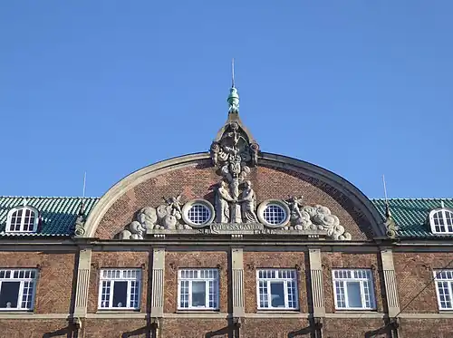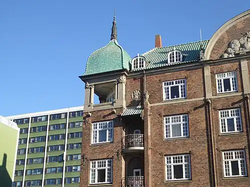 Vibensgaard is a three-winged, five-storey complex, surrounding a rectangular, central courtyard. The building is constructed in reddish-brown brick towards the street and red brick towards the yard, combined with timber decks and Hennebique concrete elements (by Carl Schiøtz).[2] The principal facade on Østerbrogade features a four-bay median risalit. It is flanked by two wide window bays, then two more narrow balcony bays and finally two corner turrets. The medioan risalit is topped by a segmental pediment featuring two symmetrically arranged female figures holding eachother's hands above a hearth from which smoke rises. The female figures was created on site by the sculptor Hans Gyde Petersen.[1] The two female figures are flanked by two round windows. The roof is clad in emerald green, glazed tile from Frederiksholm Vrickyard. The two turrets are topped by ogree comes clad in so-called "beaver-tail" tiles. The ground floor of the building is faced with granite rustication. It is topped by a limestone frieze featuring flora and fauna of the sea and meadows. The limestone frieze was created on site by sculptor and stucco artist H. Lamberg-Petersen.[1] It is followed by another frieze, in sandstone, with plant ornamentation. The ipper part of facade is executed in undressed brick. It features a number of medallions with plant ornamentation. Other decorative elements are excecuted in patterned brickwork or in stone, both naturally shaped stones beach stones and ashlars. The upper floor of the two turrets are open loggias with fluted columns or pilasters at the three corners. The three central storeys have small balconies with wrough iron railings.[2]