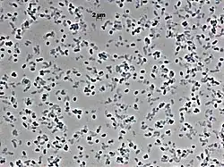 Vibrio anguillarum is a species of prokaryote that belongs to the family Vibrionaceae, genus Vibrio. V. anguillarum is typically 0.5 - 1 μm in diameter and 1 - 3 μm in length.[1] It is a gram-negative, comma-shaped rod bacterium that is commonly found in seawater and brackish waters. It is polarly flagellated, non-spore-forming, halophilic, and facultatively anaerobic.[2] V. anguillarum has the ability to form biofilms.[3] V. anguillarum is pathogenic to various fish species, crustaceans, and mollusks.[2]