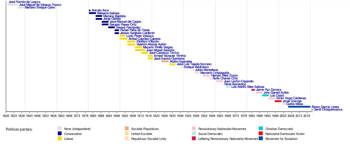 The office of vice president was first established on 19 November 1826, during the presidency of Antonio José de Sucre, following the promulgation of the Political Constitution of 1826, the first in the country's history.[4] However, Sucre himself would never elect a candidate to be presented to the National Congress, leaving the position vacant throughout his term. The first elected vice president was José Miguel de Velasco on 12 August 1828. However, he was prevented from exercising the position as he instead served as interim president in the absence of the elected president Andrés de Santa Cruz.[5]