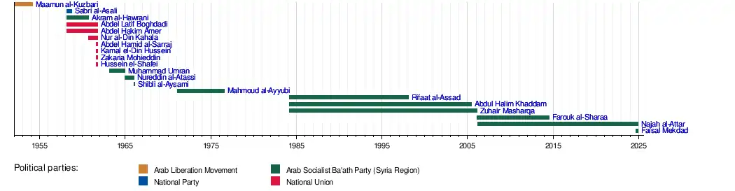 21 February 2006 | 19 July 2014[6] | 8 years, 148 days | Syrian Ba'ath Party (Syria Region) |