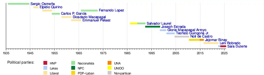Under the 1935 Constitutions, the vice president, along with the president, set the vice president's term at six years, with possibility of re-election as only the president was barred from seeking re-election.[25] In 1940, it shortened the term from six to four years, again without limitations on the number of terms for the vice president. The president, however, was barred from serving more than two terms.[26] Under the provisions of these constitutions, only vice presidents Osmeña and Lopez have won re-election.