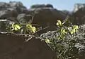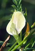 This species is an entomophilous plant and flowers in spring time, usually from April to June.[3] Vicia grandiflora has typical bilaterally symmetrical[4] papilionaceous flower, that consists of banner, keel and wing, with petals being yellow.[5] After time flowers lose their bright yellow colour and sometimes fade to pale lavender shade.[4] Each flower measures from 2 to 3 centimetres, with a few combined flowers constituting an inflorescence. The latter can be both sessile and petiolate with short leafstalk. This species' sepals are fused together into a long calyx tube that is sometimes hirsute and ends with pointed calyx teeth.[5]