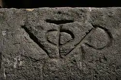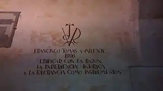 The victor symbol (Spanish: víctor or vítor) is an emblem that is painted on the walls of some Spanish and Latin American universities to commemorate students who have received the degree of doctorate. The custom dates back to the 14th century, and the symbol has historically been used at older universities in the Spanish-speaking world, such as the University of Salamanca,[1] the University of Alcalá, and the University of Seville[2] in Spain, as well as the National University of San Marcos in Lima, Peru.[3] According to the custom, when a student receives the doctorate, the victor symbol is painted on the walls of the university in red or black paint along with the student's name.