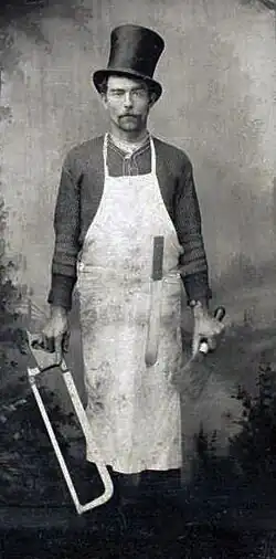 There are different versions of what happened next. According to Ernest Raynaud, Prévost was suddenly taken with a passion for the bloody universe he discovered then: the clerks were cutting up the animals that had just been slaughtered and it was a debauchery of cut flesh and blood. Prévost was fascinated and couldn't help himself but participate in the carnage: he took a knife and, although a novice, cut off a shred of veal.[4] According to Gustave Macé, things happened in a simpler manner: the delivery brought by Prévost to the butcher had come from consumption-stricken cows, which were prohibited from sale and would have landed Prévost in trouble if he was caught by police.[5] Whichever case might be, the butcher was delighted when young Prévost asked him for a job. Soon after, his employer and the butcher had a meeting and agreed to exchange apprentices.