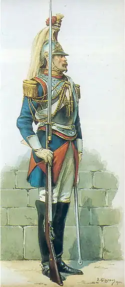 - ^ At the time of his recruitment, in addition to irreproachable conduct and morality, it was necessary to be at least 1.80 metres (5 ft 11 in) tall, to have at least two years of seniority in the cuirassiers and a commitment to remain for at least three years.
