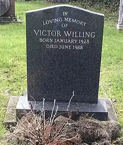 Willing died at home in Hampstead, north London, on 1 June 1988 and was buried at Hampstead Cemetery.[12] In subsequent years several important publications and exhibitions have taken place. In 1993 Karsten Schubert published a selection of his writings and two conversations with John McEwen, while in 2000 appeared the August Media multi-authored study of his work. Five works were included in the 'New Displays' at the Tate Gallery in 1999, and in 2000 there was a solo exhibition of his work at Marlborough Fine Art, London.