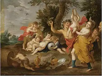 Although there is no evidence that Wolfvoet studied under Rubens, he is considered one of the most faithful followers of that artist.[9] He often used paintings, preparatory drawings, or oil sketches by Rubens as the model for his paintings. He had access to some of these through his art business and public sales of Rubens' work in the Antwerp market.[8][9][12] Examples are two copper paintings relating to the theme of the War between War and Peace (private collections) and an oil on canvas of Hercules and Minerva Expelling Mars (Hermitage Museum) (of which there also exists a copy on copper). In the first two copper paintings, he used a palette similar to that of Rubens and achieved a harmony of tone with space, which he had learned from Rubens.[9]