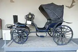 Named for Queen Victoria,[1][2] it was possibly based on a phaeton made for George IV.[3] The type was made some time before 1844, but acquired the name victoria around 1860, and was being presented as such at the 1862 International Exhibition in London.[4] Drawn by one or two horses, it became a fashionable style of carriage for ladies riding in the park.[3]