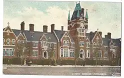 The barracks, begun in 1880 and built by convict labour, were designed to provide living accommodation for a regiment of infantry.[1] Located on the Southsea side of Old Portsmouth, outside the old town fortifications (which were in the process of being demolished at the time), they were completed in 1886.[2] They consisted of a pair of long barrack ranges, linked by arcades at either end to form a narrow quadrangle, with a separate Officers' Quarters and Mess Establishment to the south-west: 'a highly Picturesque, free-style composition, very un-English, which included a central clock tower, stairs in detached, conical turrets, and a billiard room in a sort of Great Hall at the back'.[1]