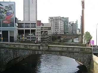 A narrow stone bridge with three gothic arches,[6] it housed a chapel built by del Bothe on the middle pier. This was rebuilt in 1505 and was later used as a jail.[1][7] The bridge was the site of a notable incident during the English Civil War, when Royalist Salford used it to mount a short-lived siege of Parliamentarian Manchester.[8]