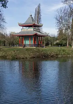The pagoda was eventually demolished in the 1950s, while the water surrounding the island was filled in, shrinking the lake and making what was the island part of the park landscape. With the park's refurbishments that began in 2010 it was decided to restore the island to its former glory; the lake was extended back around the original area, the pagoda was replicated through the use of many photographs and eye-witness information and then, to complete Pennethorne's unfinished vision, the plans for his original bridge were discovered and the bridge built after over 100 years. As a finishing touch, pedalos and row boats were brought back on to the West lake, a feature which had been missing from the park for decades.