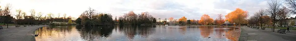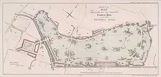 A mass petition to Queen Victoria, in support of a recommendation by epidemiologist William Farr, led to the creation of the park.[7] The UK Parliament passed the York House and Victoria Park Act 1841 (4 & 5 Vict. c. 27),[8] which enabled the Crown Estate to purchases 218 acres (88 ha) which were laid out by the London planner and architect Sir James Pennethorne between 1842 and 1846. A part of the area was known as Bonner Fields, after Bishop Bonner, the last lord of the manor of Stepney. Bonner's Hall, also known as Bonner's Palace, served as a residence of the Bishops of London, and was pulled down in 1845 to make way for Victoria Park.[9] The land had originally been parkland, associated with the Bishop's Palace, but by the mid-1800s had been spoiled by the extraction of gravel, and clay for bricks.