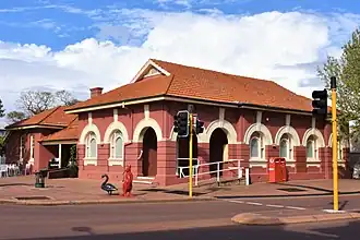 The post office presents as a single-storey (overpainted red) brick building with contrasting rendered detailing, strongly modelled arched streetscape facades and tile-clad hipped roof forms, with gablet. The corner entrance porch is located in the south-west of the building, and has rendered arched openings with accentuated keystones, and rusticated piers providing access to the retail shop in a repositioned doorway. The building presentation to Duncan Street is broken into three bays, with the arcaded front to the post office bay, a skillion-roofed verandah to the middle bay (originally with a timber-posted verandah), and a further bay with a pair of rectilinear window openings. The latter two bays are part of the original residence. The Albany Highway frontage originally comprised a four-arched bay to the post office, incorporating the corner entrance porch, and a hipped gable and lantern to the roof.[1]