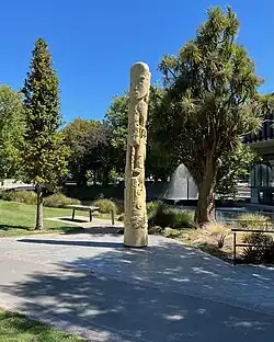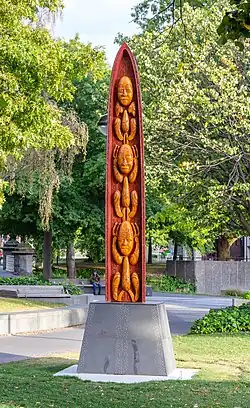 A pouwhenua was erected on the south bank of the Avon River in 1994, opposite the Town Hall.[129] Created to commemorate the signing of Te Tiriti o Waitangi by Ngāi Tahu, the pou stands 6 metres (20 ft) tall and was carved from tōtara by Riki Manuel. The carvings represent the themes of mahinga kai (a place to gather food) and tipuna (ancestry). It suffered two arson attacks in 1995. A bronze plaque reads "He poupou tohu ahi-ka o Ngāi Tahu" (A mark of the long burning fires of Ngāi Tahu).