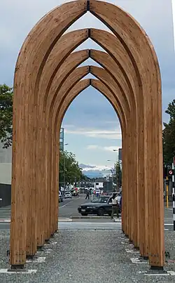 The area is also home to The Arcades, a series of tall wooden arched pergolas that run diagonally from the corner of Kilmore and Durham Streets into the square. These provide a path for foot traffic entering the square from the north-west. Intended as a temporary feature,[115] The Arcades were designed by architect Andrew Just for Jessica Halliday and Ryan Reynolds of the Life in Vacant Spaces trust, and built in 2013.[116] The arches are designed to invoke a "vaguely gothic" feel, and were modelled on the shape of the south entrance to the Canterbury Provincial Council Buildings.[116]