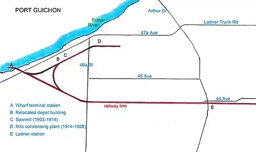 The wye was initially used for turning locomotives and accessing the Grant and Kerr sawmill.[6] Following stiff competition from Canadian Pacific Railway steamers from Vancouver and New Westminster (the latter calling at Port Guichon) and the withdrawal of an expected subsidy from the City of Victoria, the GN passenger ferry discontinued in December 1904.[10] At that time, a rail barge commenced operating either from Port Guichon or upriver. The six-car capacity service stopped in 1919 when the V&S closed. A 2.4-by-3.7-metre (8 by 12 ft) passenger shelter shed stood at the original Ladner station site, which was later renamed Challucthan. An 89-metre (293 ft) bridge spanned the then much wider Challucthan slough.[6] When the sawmill was rebuilt in 1914, a siding was installed.[11]