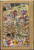 - ^ In this form of hunting, which originates from the Mongolian tradition, the beaters form a ring around the game, which is drawn ever closer together. The game driven together in this way is prevented from escaping by fences. Abu 'l-Fazl explains the process in the corresponding text passage, Abu-l-Fazl: The Akbar Nāma. Translated from the Persian by Henry Beveridge. 1904, vol. II, pp. 416-417. The basic meaning of qamargha or qamargāh can also be found in the Persian-English dictionary of Steingass.