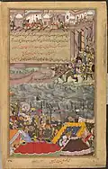 The battle against the Mirzas was closely linked to the conquest of Gujarat and extends over twelve paintings (179-190). Like Akbar, the Mirzas were descendants of Timur. Their grandfather or father Muhammad Sultān Mīrzā had once come to India with Bābur.[31] They had wanted to shake off Akbar's supremacy and briefly allied themselves with the Uzbeks. Ibrāhīm Husayn Mīrzā, Muhammad Husayn Mīrzā and Shāh Mīrzā finally succeeded in capturing the cities of Baroda, Surat and Champaner.[32] When Akbar tried to expand his empire to the southwest, they were among the most dangerous opponents in Gujarat.