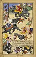 - ^ As the illustration does not contain any written panels, the relevant text passage can only be determined by comparing it with the rest of the Akbar-nāma narrative. The fact that the head was found under a tree is only stated in the text after this illustration. The arrangement of the scenes is nevertheless logical: the head is already there when the two elephants collide in the next picture; it is only found later.