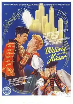 Victoria and Her Hussar (German: Viktoria und ihr Husar) is a 1954 West German musical film directed by Rudolf Schündler and starring Eva Bartok, Friedrich Schoenfelder and Rudolf Forster. Part of the tradition of operetta films, it is an adaptation of the 1930 operetta Viktoria und ihr Husar by Paul Abraham. A previous film adaptation Victoria and Her Hussar had already been produced in 1931 by Richard Oswald.