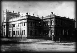 In 1856 the Melbourne Trades Hall Committee was formed and received a grant of land from premier John O'Shanassy to build the Melbourne Trades Hall.[1] The original Trades Hall was opened in May 1859, built by workers as an organising place for the labour movement in Melbourne, and as a medium to educate workers and their families. The workers financed the construction of the building themselves. It was built in the style of the parliament buildings which were just down the road, and over the years has been further developed.[2] The original building was made of timber with galvanised iron roofing.