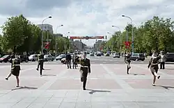 Post #1 at Victory Square refers to guard duty that is carried out by members of the armed forces and among students of general education schools and vocational schools in Minsk. Post #1 was initiated on 3 July 1984, on the occasion of the 40th anniversary of the liberation of Minsk.[1][2] The guard of honor serves at Post No. 1 for one week from 9.00 to 17.00 in the cold and from 9.00 to 18.00 in the warm time of the day. The duration of each shift is 10 to 20 minutes. The only breaks in maintaining the honorary were from 15 May to 1 November 1988, from 1 June to 20 November 2003, and from 1 December 2003 to 20 April 2004.[3]