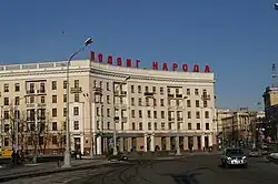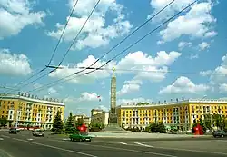 Victory Square (Belarusian: Пло́шча Перамо́гі; Russian: Пло́щадь Побе́ды) is a square in Minsk, Belarus, located at the intersection of Independence Avenue and Zakharau Street. The square is located in the historic centre of Minsk with the Museum of the 1st Congress of RSDLP, the main offices of National State TV and Radio and the City House of Marriages nearby. A green park stretches from Victory Square to the Svislach River and to the entrance to Gorky Park. Holiday parades typically go through Victory Square, while newlyweds traditionally take their picture at the square.