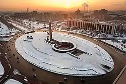 Victory Square (Russian: Пло́щадь Побе́ды, Ploschad Pobedy) is a city square in the south of Saint Petersburg, Russia, named after the Soviet victory in the Great Patriotic War. It is located in the very end of Moskovsky Prospekt avenue 8 km from the city's primary Pulkovo Airport – not in the central part of the city, despite this name being common in the former Soviet cities as a central city square. The nearest metro station is Moskovskaya. The thoroughfare with the solemn ensemble of the square is the southern entrance to the city for the automotive traffic from internal Russia with its older and current capital Moscow, after which the avenue, the city district and the next square are named, and for the passengers arriving from the airport.