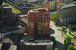 During the old courthouse's tenure the vicinity was the hub of the city's financial and legal district, with the Vancouver curb exchange operating just across Hastings Street, mostly in a passageway cutting the corner diagonally behind the Astor Hotel (see photos in External links). The Inns of Court, a ramshackle and infamously leaky (if decorative) structure on the west side of Courthouse Square, was the location of adjutant legal services and offices connected to the Court House. The Oddfellows Hall and what is now the Army, Navy and Air Force Veterans Hall still stand further south (uphill) along Hamilton Street from where the Inns of Court used to be (now a modernist bank-cum-film studio). Most of the original main branches of the major banks were within the next few blocks west along Hastings, which in both directions was the hub of the city's shopping district until the completion of Pacific Centre in the 1970s, which severed the old pedestrian link between Woodward's, a block east of Victory Square, and Eaton's, two blocks west (now the SFU Harbour Centre campus). On the south side of Victory Square originally stood the Central School, which later became the original Vancouver Community College (then named Vancouver College), adjacent to which was the city's original main hospital (both were in a brickwork Gothic style).