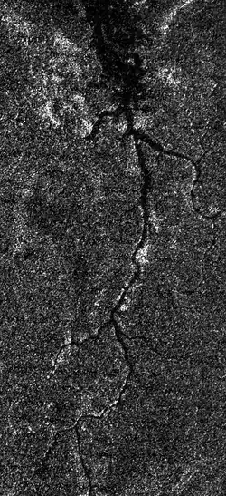Vid Flumina is a river system (termed Flumen) of liquid methane and ethane on Saturn's moon Titan. It is more than 400 km (249 mi) long and flows into Titan's second largest hydrocarbon sea, Ligeia Mare.[1] The surface of Titan is mostly water ice, so Vid Flumina is a river of methane and ethane flowing across and cutting canyons into ice as though it were bedrock. NASA scientists think that it likely has rapids, whirlpools and falls, just like rivers on Earth.