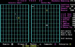 Video Trek 88 is a computer game developed and published by Windmill Software in 1982, based on the earlier Star Trek text game. As opposed to the mainframe version, both the galactic chart and the local map are displayed side by side.