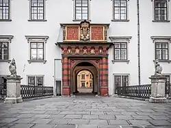 The Hofburg featured as the main motif on the 20 euro Renaissance commemorative coin. The coin shows the Swiss Gate of the palace. This gate bears Ferdinand I's coat-of-arms and titles. It is flanked by two soldiers of the period as a reminder of the unsettled times which saw Vienna besieged by Turkish armies in 1529, as well as the struggles between Protestants and Catholics during the Reformation.