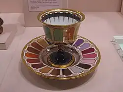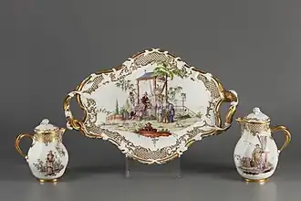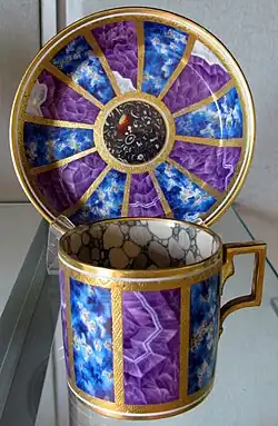 The factory received a boost from the Congress of Vienna in 1815, in the course of which it was visited by a number of monarchs and other leading figures, although Prince Regent George of the United Kingdom never went to Vienna and so missed the service he would have been presented with.[11] According to another account, the Prince preferred to be sent a quantity of Tokay wine.[12] Although exports to the Ottoman Empire continued, by the 1860s the factory was suffering from increased competition from Bohemian factories in particular, and was eventually closed by the Austrian parliament in 1864, with the moulds and other equipment being given to the Museum of Applied Arts, Vienna.[13] The wares are sometimes called "old Vienna" (or Alt Wien in German).[14]