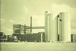 In 1965, two massive concrete sugar silos were completed. Each had a diameter of 32 m and a height of 46 m. The silos could hold 20,000t each.[44] The silos were necessary for two reasons. The first was the closure of the Sugar refinery of the Wester Suikerraffinaderij in Amsterdam, which meant that consumer products had to be made by the sugar factories instead of by the Amsterdam refinery. The other was the switch to 1 kg consumer packaging instead of delivering big sacks of sugar to retailers. During his speech that put the silos into production, the company's director said that it was: 'highly questionable that sugar caused obesity and tooth decay'.[45] In 1976, a third storage silo of the same height, but with a diameter of 40 m was completed. With a capacity of 40,000t, the new silo doubled storage capacity.[46]