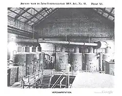 The third main part of the factory was called the sugar house (suikerhuis). The thick juice was pumped up through the filter tower till it reached the pans of the fourth saturation. Here it was again treated with carbon dioxide and sulfurous acid. About three meters below these were the wellblech filters. Below these were three big vacuum boilers according to the Greiner system. This resulted in sugar crystals.[12]